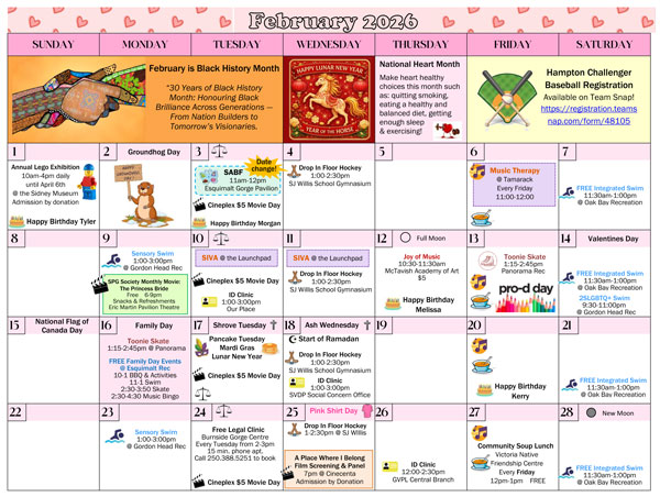 Check out our February calendar! This month is filled with family day activities, pink shirt day, pancake day, lunar new year, and more!