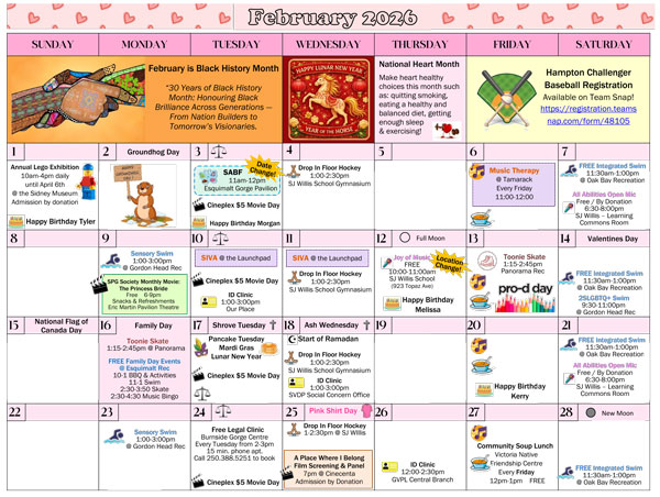 Check out our February calendar! This month is filled with family day activities, pink shirt day, pancake day, lunar new year, and more!